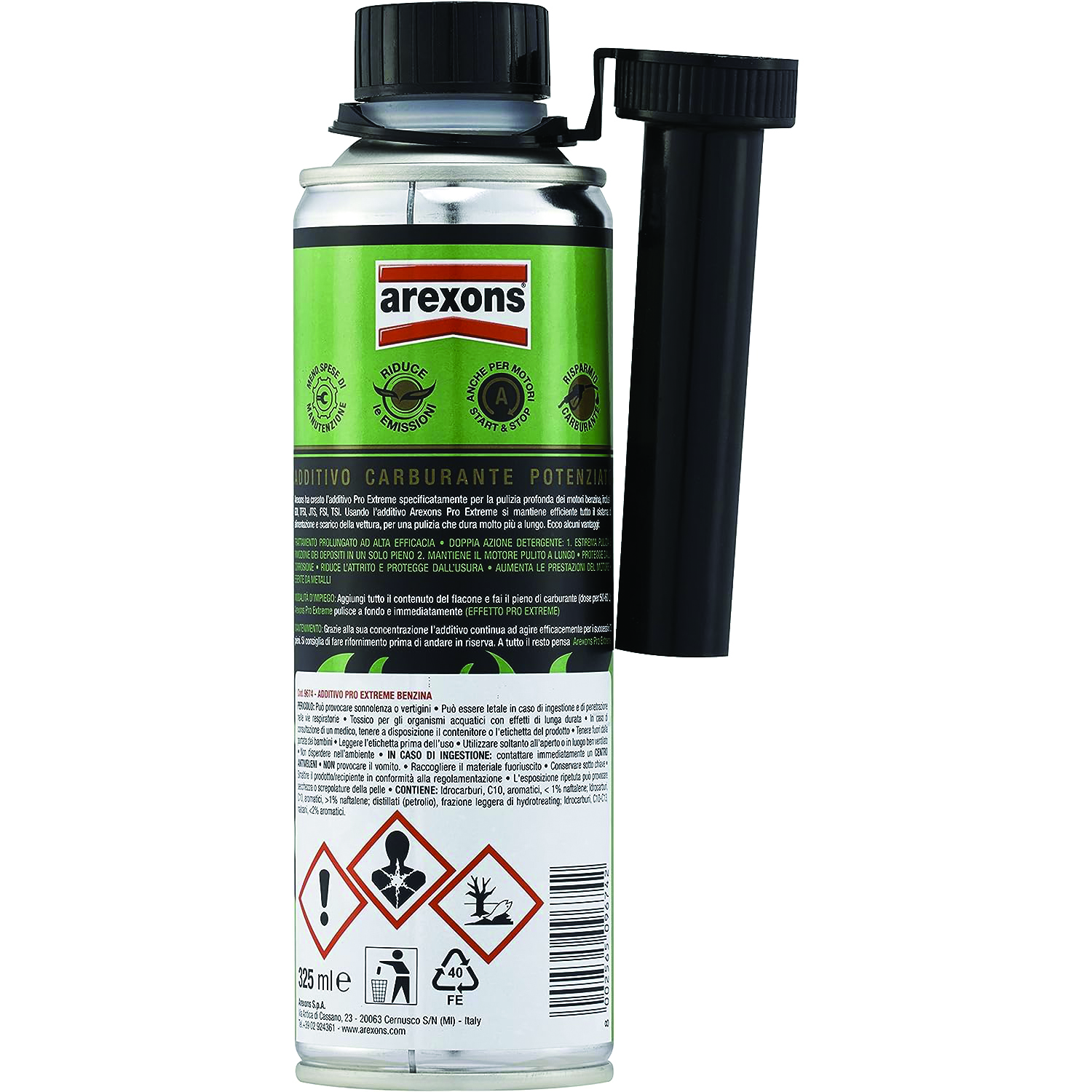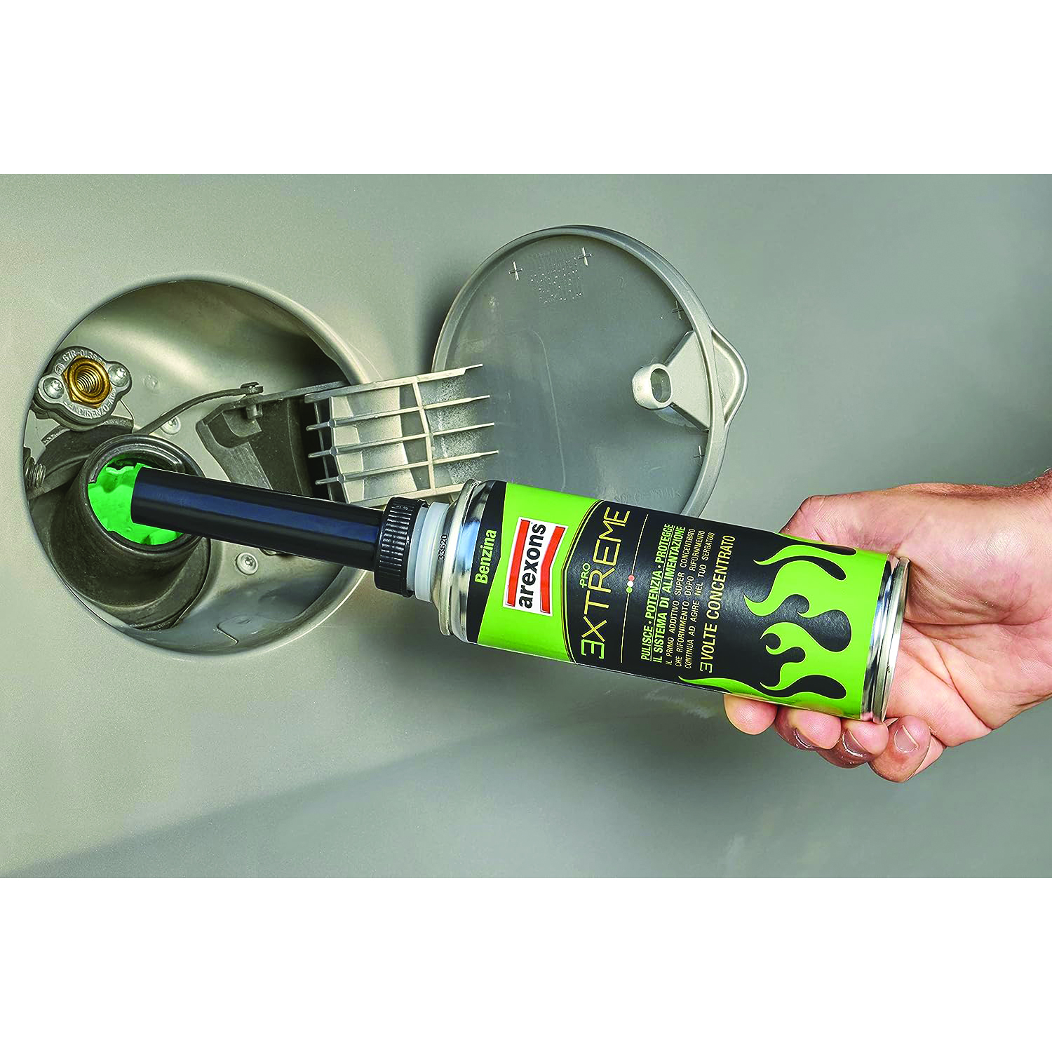 Aggiungi tutto il contenuto della bombola e fai il pieno di carburante (dose 50-60 L): Arexons Pro Extreme pulisce a fondo e immediatamente.