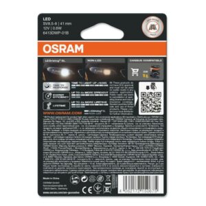 Le lampade di segnalazione LEDriving SL C5W offrono una luce moderna e intensa con una temperatura di colore fino a 6.000 Kelvin. Queste lampade sostitutive sono adatte a tutti gli attacchi per lampade C5W convenzionali. Rispetto alle lampade standard, queste lampade LED retrofit consumano fino all’80% in meno di energia. OSRAM offre una garanzia di 4 anni per queste lampade LEDriving SL. Questi prodotti non sono omologati ECE, dunque non possono circolare sulle strade pubbliche. L’uso non consentito dalla legge comporta il ritiro della carta di circolazione e la perdita della copertura assicurativa. La vendita e l’uso di questi prodotti non sono consentiti in alcuni paesi. Contatta il distributore di zona per verificarne la disponibilità nel tuo paese.