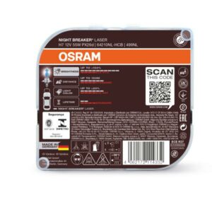 Grazie all’innovativa tecnologia ad ablazione laser, le lampade alogene NIGHT BREAKER LASER brillano fino al 150% in più rispetto allo standard minimo di legge. Il filamento altamente ingegnerizzato garantisce un’ulteriore spinta di luce. Di conseguenza, le lampade forniscono un fascio lungo fino a 150 m e una luce fino al 20% più bianca rispetto allo standard minimo di legge. Una maggiore luminosità e una migliore visibilità possono aiutare i conducenti a identificare e reagire più rapidamente ai pericoli del traffico. Ultimo ma non meno importante: OSRAM NIGHT BREAKER LASER colpisce per il suo design unico (nome del prodotto inciso al laser) e il portafoglio completo (H1, H3, H4, H7, H8, H11, HB3, HB4).